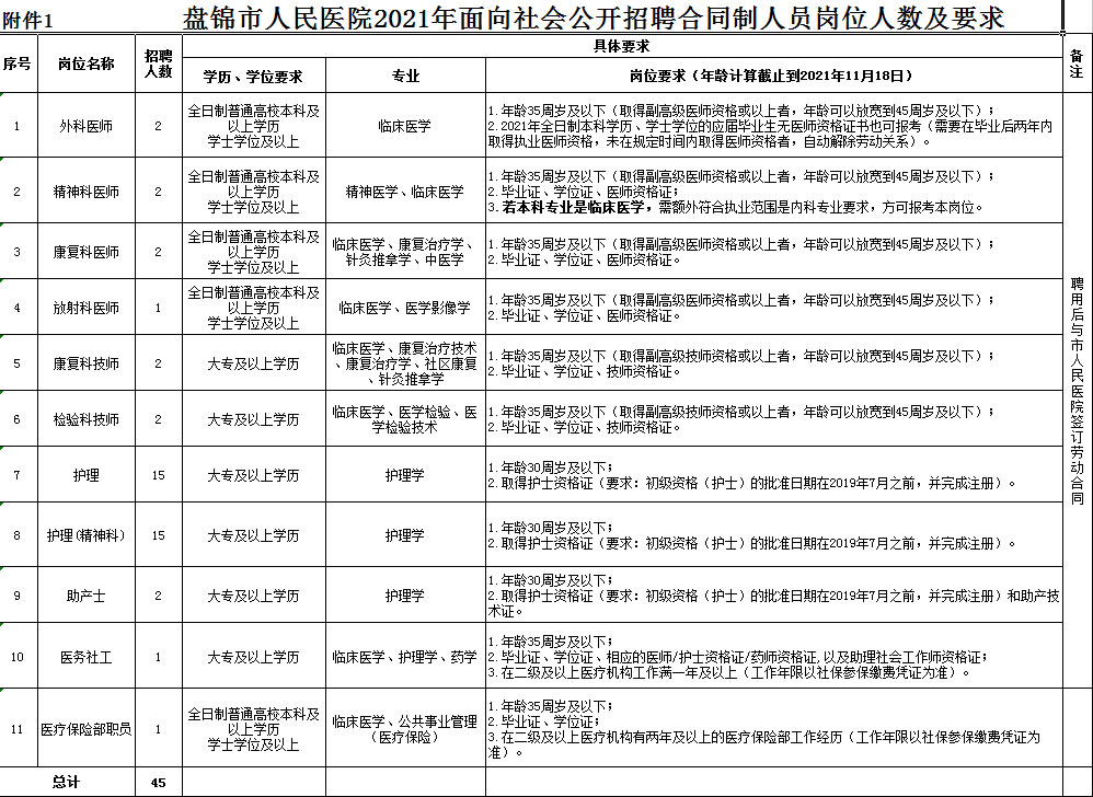 2.崗位所需要的其他條件,詳見《盤錦市人民醫(yī)院2021年面向社會公開招聘合同制人員崗位人數(shù)及要求》(附件1);