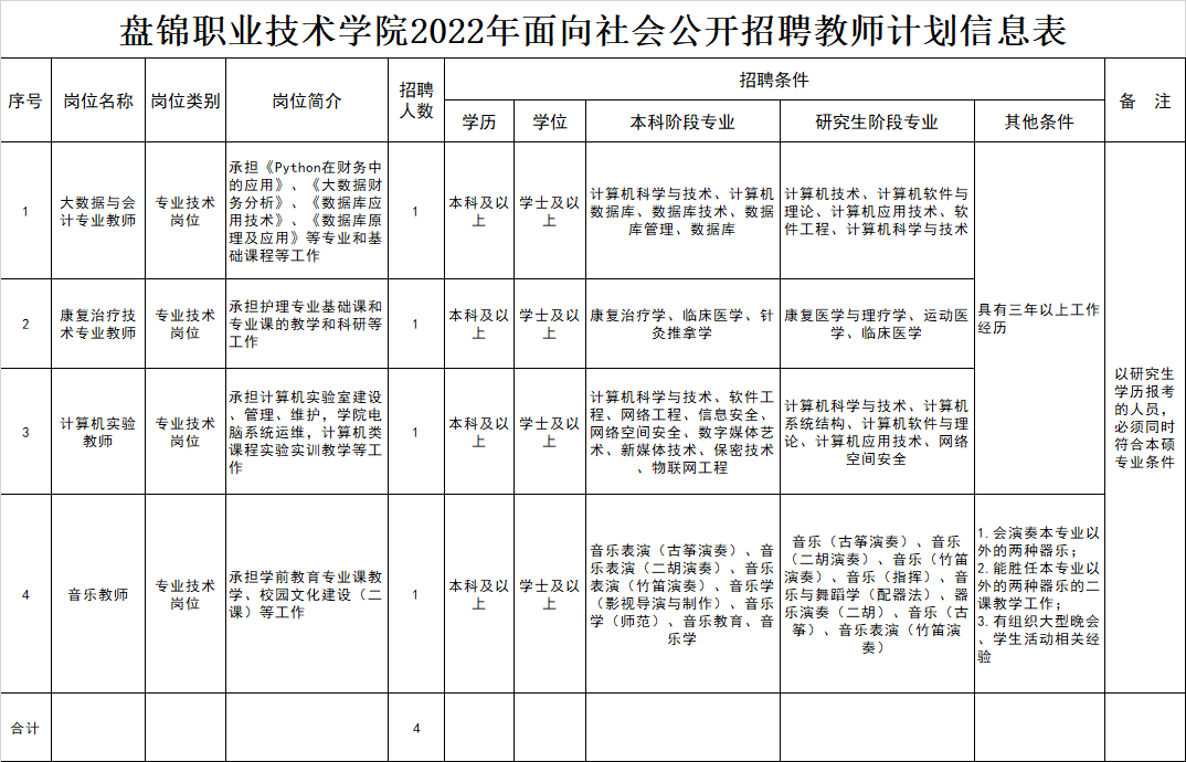 (五)崗位所需要的其他條件,詳見《盤錦職業(yè)技術(shù)學(xué)院2022年面向社會公開招聘教師計(jì)劃信息表》(附件1),所招聘崗位均為全額撥款事業(yè)編制。
