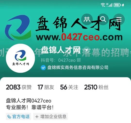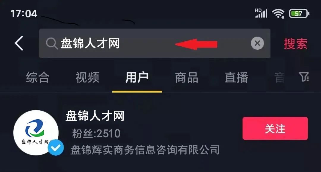 1、打開抖音APP 在左上角的搜索欄輸入: “盤錦人才網(wǎng)”,選擇“盤錦輝實商務信息有限公司”