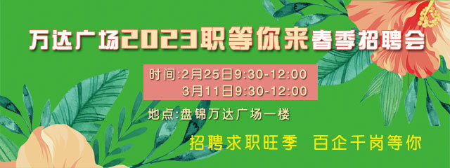 由盤錦萬達(dá)廣場商業(yè)管理有限公司(萬達(dá)廣場)舉辦的《盤錦萬達(dá)廣場2023職等你來春季招聘會》2023年2月25日 2023年3月11日舉行