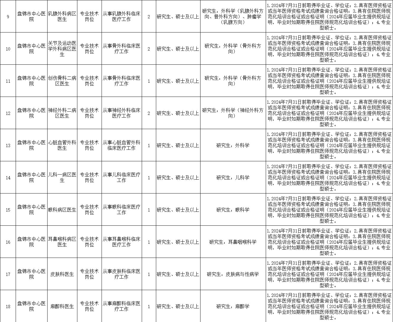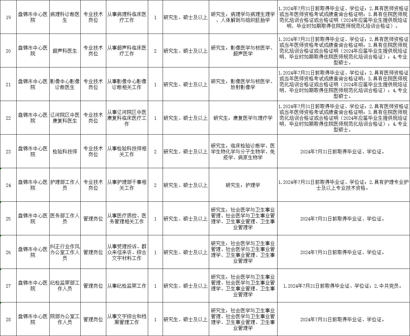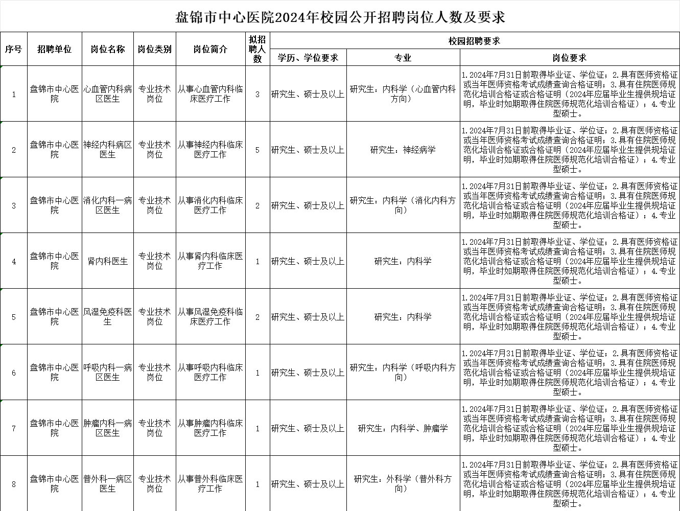 3.崗位所需要的其他條件,詳見(jiàn)《盤錦市中心醫(yī)院2024年校園公開招聘崗位人數(shù)及要求》(附件1)。