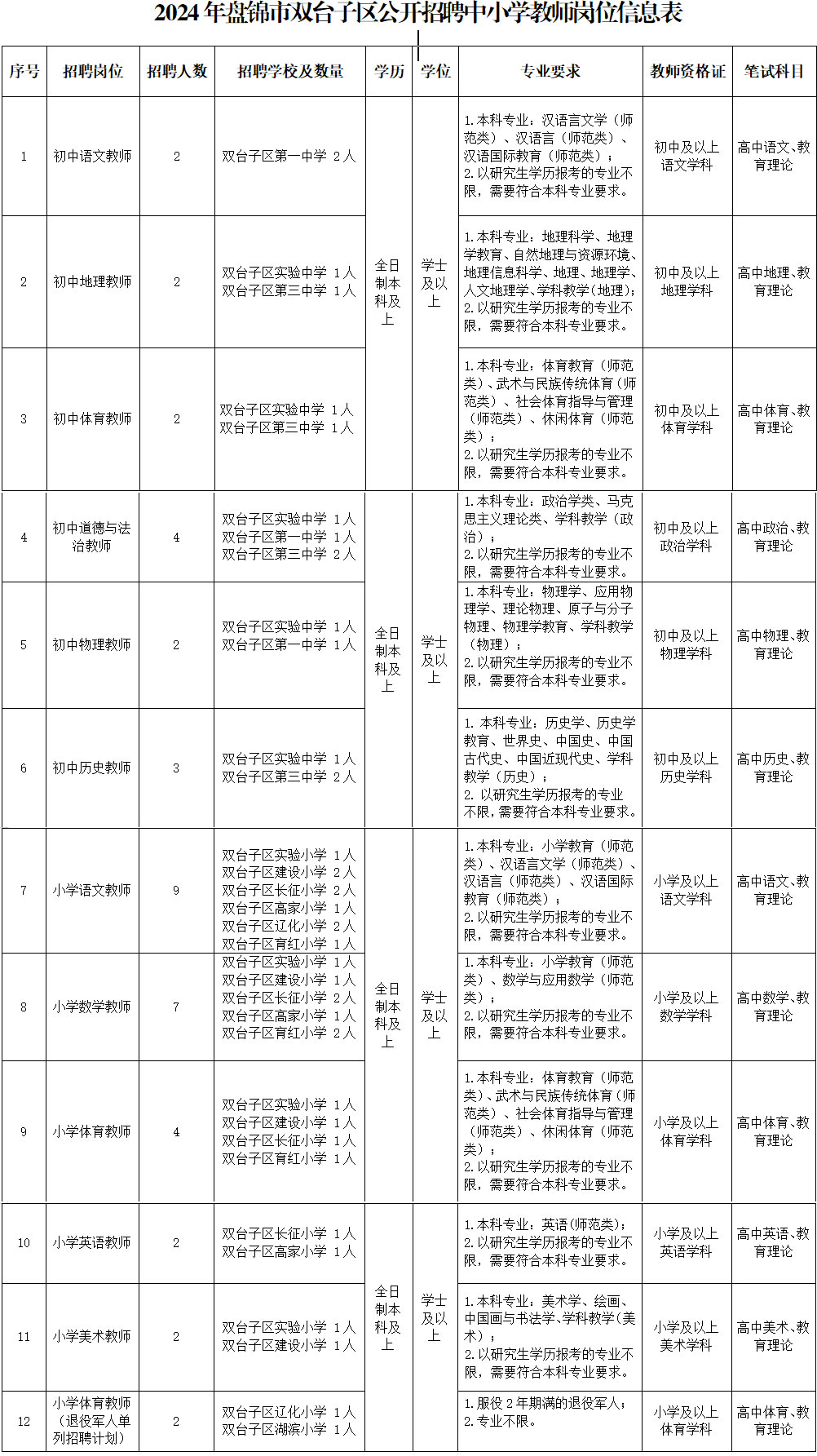 本次面向社會公開招聘41名事業(yè)編制教師,其中中學(xué)教師15名,小學(xué)教師26名(含面向退役軍人招聘2名),具體崗位詳見《2024年盤錦市雙臺子區(qū)公開招聘中小學(xué)教師崗位信息表》(附件1)。