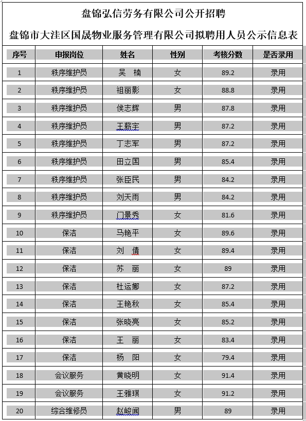 盤錦弘信勞務(wù)有限公司公開招聘盤錦市 大洼區(qū)國(guó)晟物業(yè)服務(wù)管理有限公司擬聘用人員公示