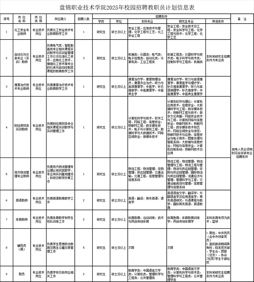 (五)崗位所需要的其他條件,詳見《盤錦職業(yè)技術學院2025年校園招聘教職員計劃信息表》(附件1)。