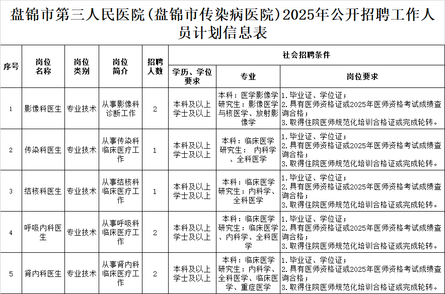 3.崗位所需要的其他條件,詳見(jiàn)盤錦市第三人民醫(yī)院2025年公開(kāi)招聘工作人員計(jì)劃信息表附件1。