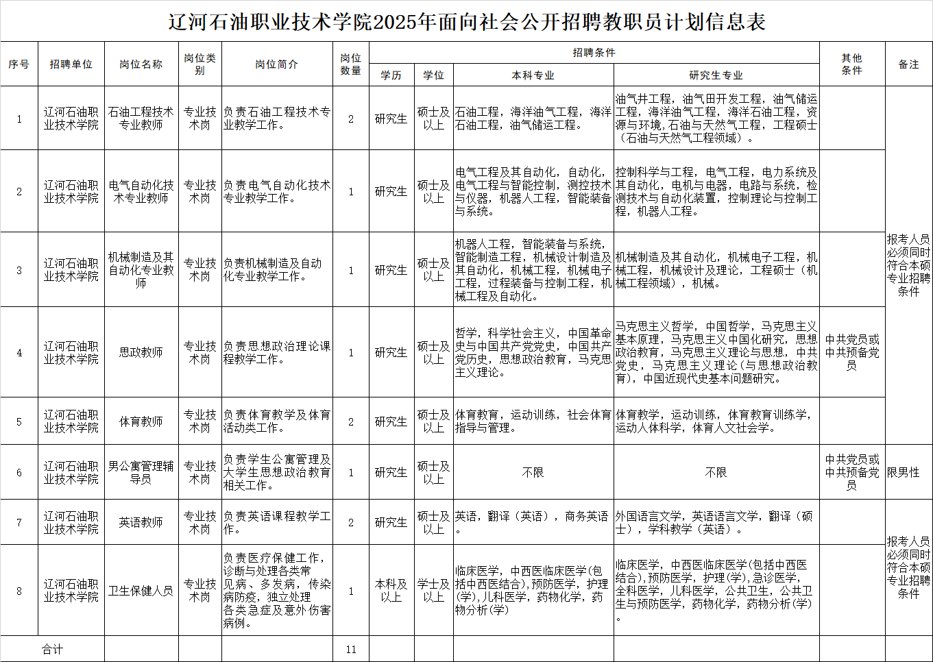 (五)崗位所需要的其他條件,詳見(jiàn)《遼河石油職業(yè)技術(shù)學(xué)院2025年面向社會(huì)公開(kāi)招聘教職員計(jì)劃信息表》(附件1)。