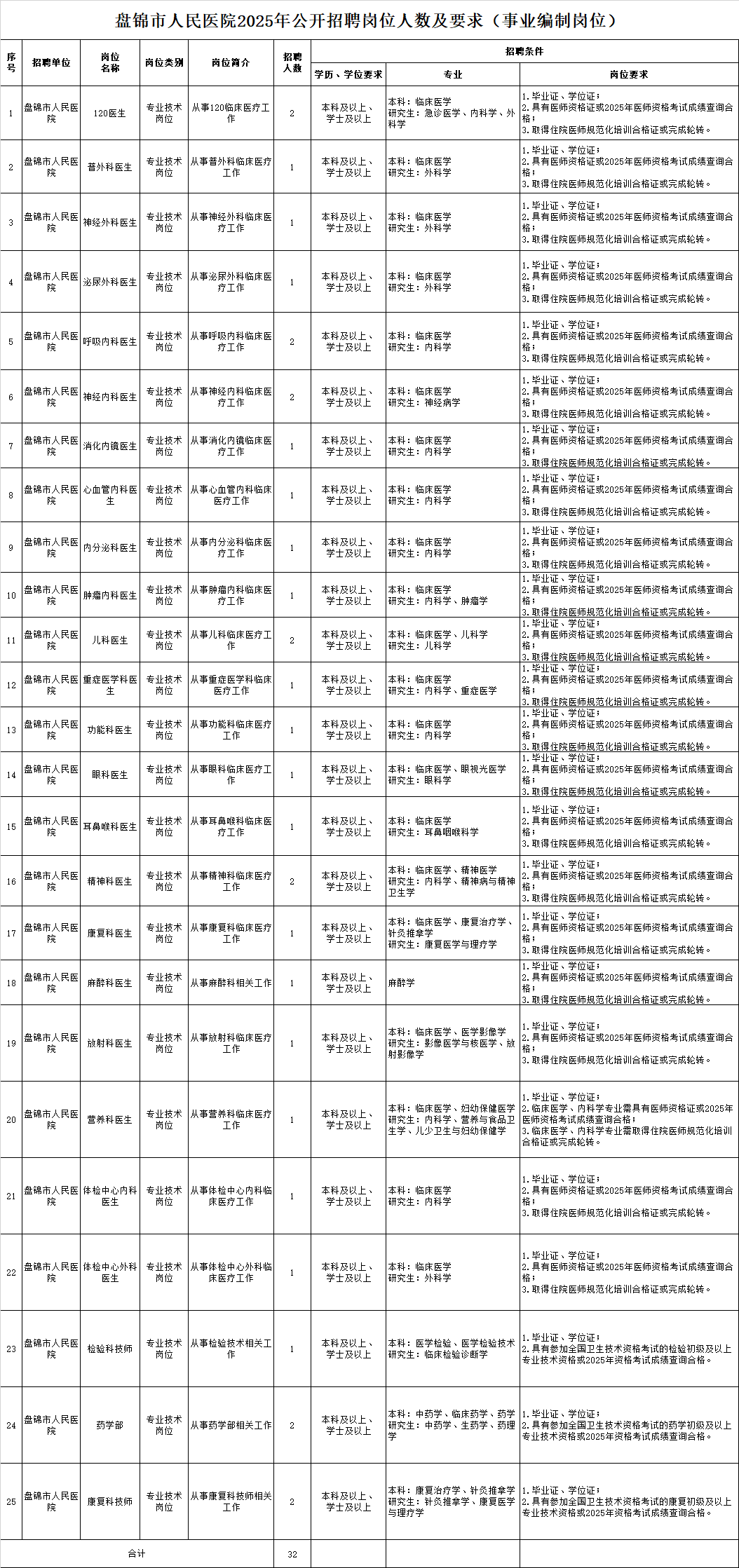 1.盤錦市人民醫(yī)院2025年公開招聘崗位人數(shù)及要求(事業(yè)編制崗位)
