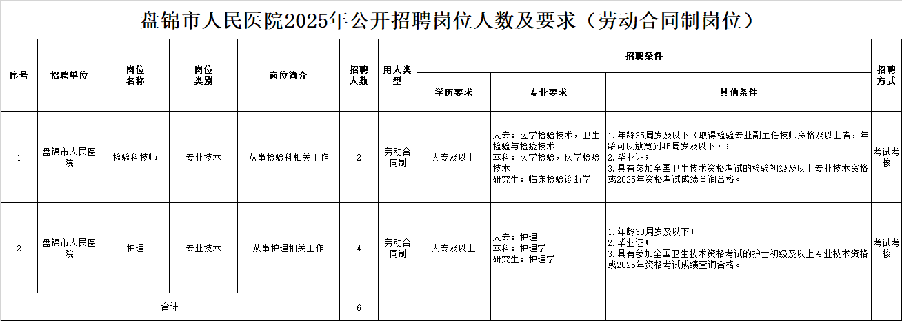 2.盤錦市人民醫(yī)院2025年公開招聘崗位人數(shù)及要求(勞動合同制崗位)