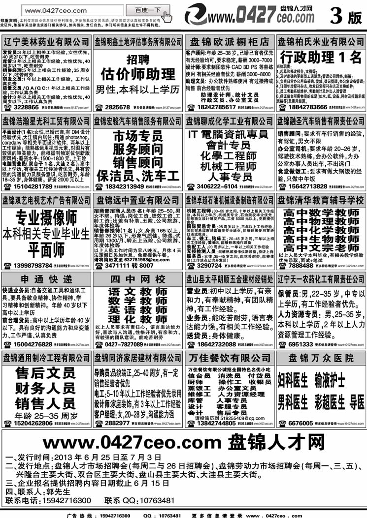 盤錦人才網(wǎng)招聘專刊第一季第三版招聘信息