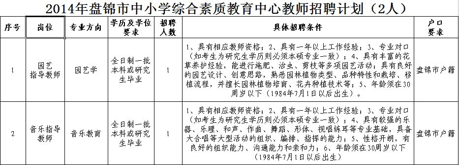 2. 盤錦市中小學綜合素質教育中心:招聘專業(yè)、人數(shù)及招聘條件