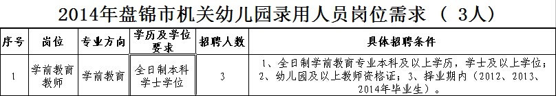 3. 盤錦市機關幼兒園:招聘專業(yè)、人數(shù)及招聘條件