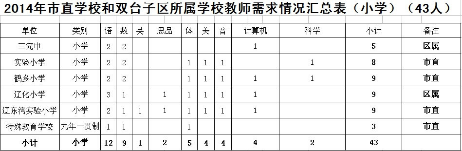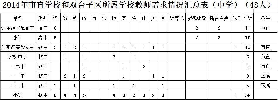 為貫徹落實《關于促進中小學公開招聘全日制師范類畢業(yè)生有關問題的通知》(遼人發(fā)〔 2007 〕 130 號)精神,進一步加強教師隊伍建設,提高教師隊伍的整體素質,促進教育均衡發(fā)展,經(jīng)與市編辦、市人社局協(xié)商決定, 2014 年盤錦市教育局計劃為市直屬學校和雙臺子區(qū)所屬學校公開招聘各類教師 98 名,現(xiàn)就相關情況公告如下: