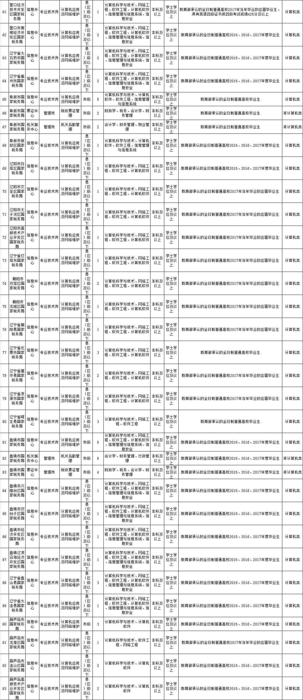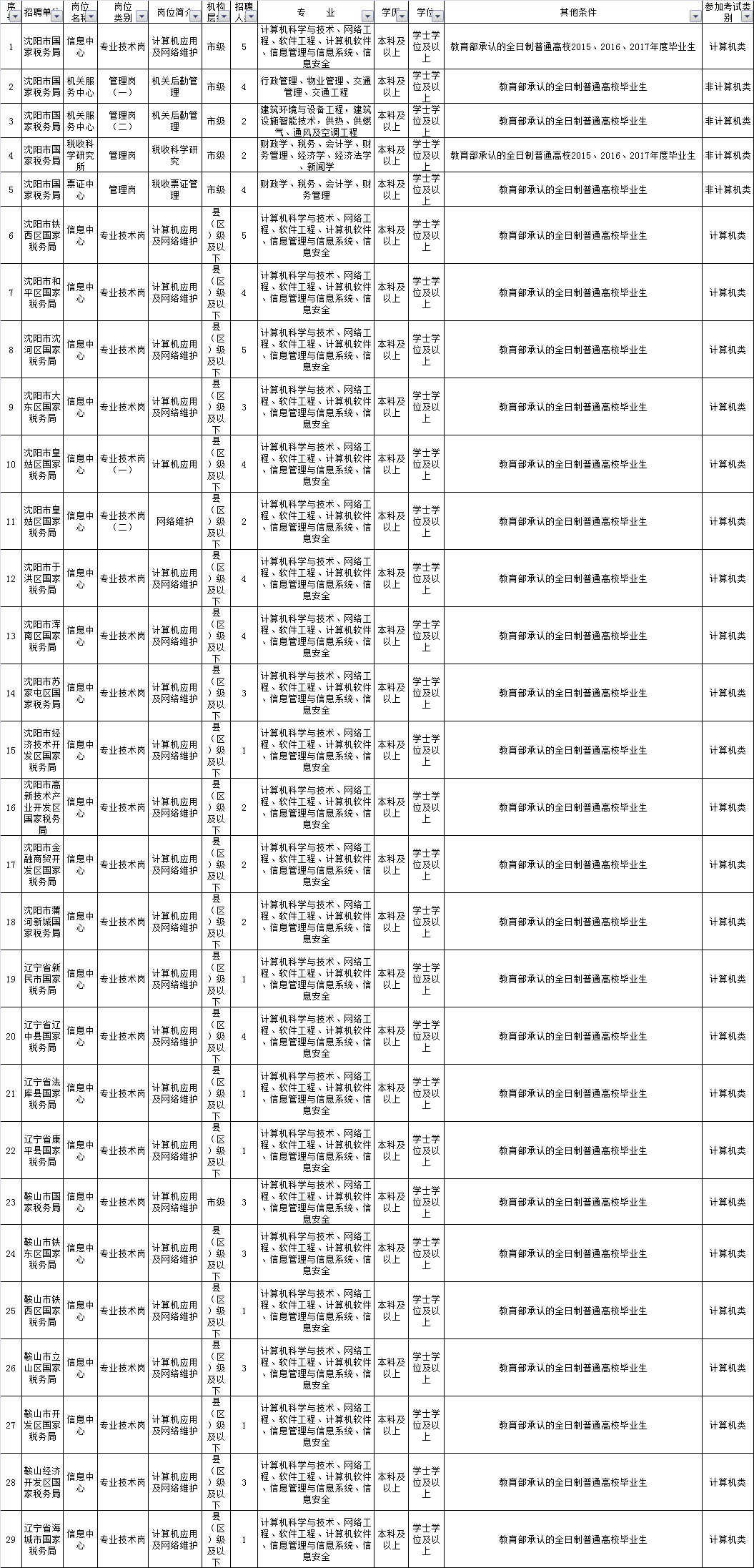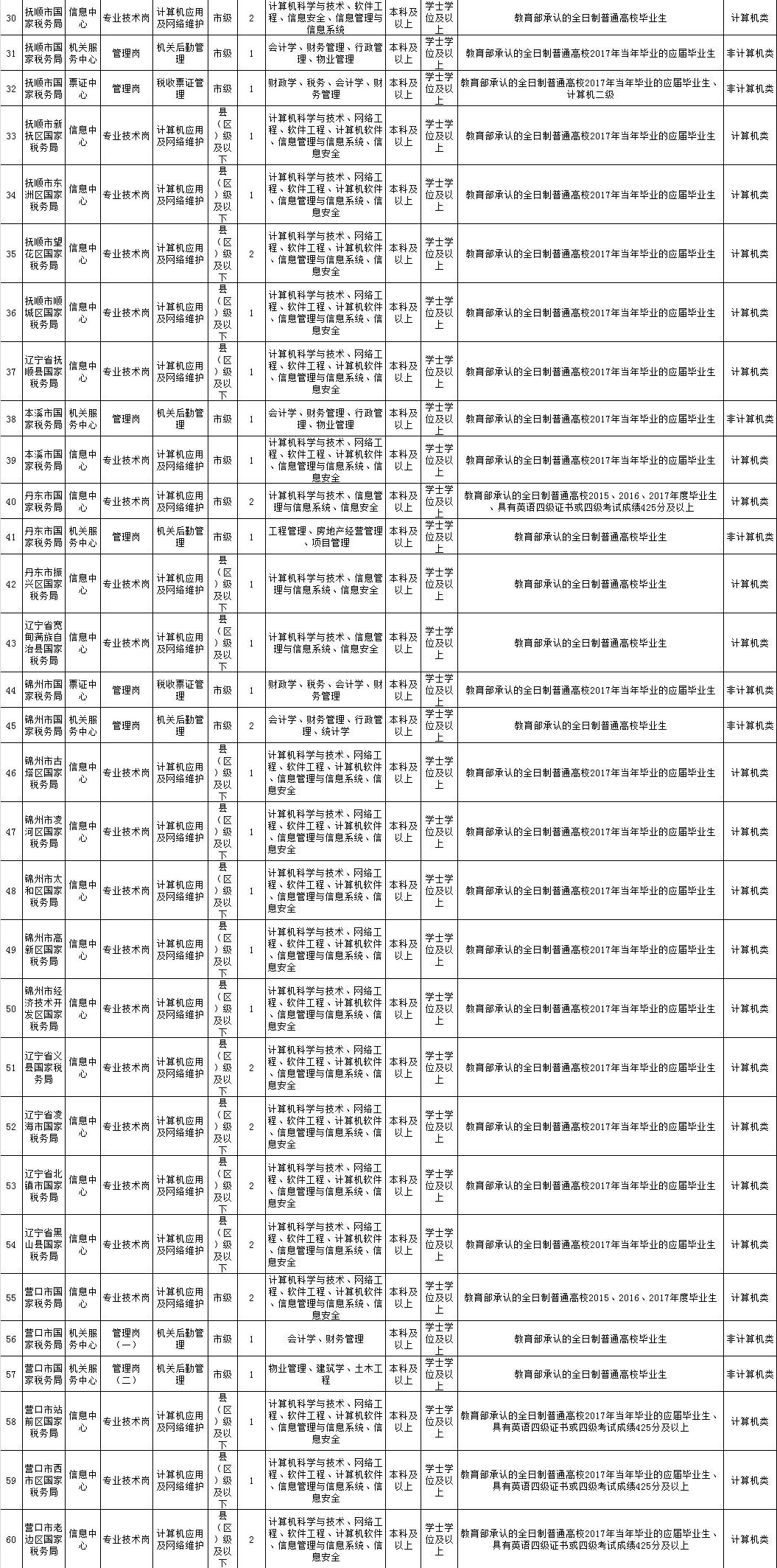 (七)具備招聘崗位所規(guī)定的其他條件(詳見(jiàn)附件《遼寧省國(guó)家稅務(wù)局系統(tǒng)2017年公開(kāi)招聘事業(yè)單位工作人員計(jì)劃信息表》),本表根據(jù)2017年度各市國(guó)家稅務(wù)局事業(yè)單位實(shí)際崗位需求進(jìn)行編制。根據(jù)國(guó)稅系統(tǒng)2018年度公務(wù)員招錄《招考專業(yè)類別目錄表(本科及以上)》范圍,考生所學(xué)專業(yè)不在本表內(nèi)的一般不接受報(bào)考;