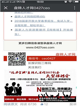 4) 盤錦人才網微信公眾號:ceo0427 (內含3萬人),公眾號每天推送的文章都含有招聘會宣傳圖片