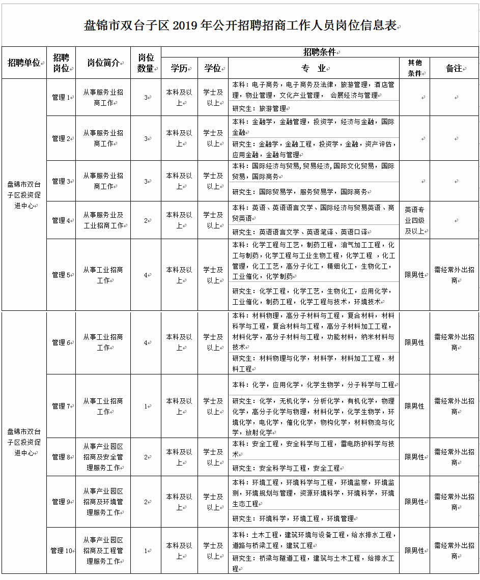 2.《盤錦市雙臺子區(qū)2019年公開招聘招商工作人員崗位信息表》